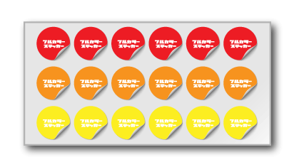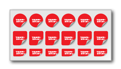 屋外利用できる耐久性、耐水性に優れたステッカー。UVラミネート加工により退色や、擦過による傷に強い仕様。 0.5㎡ 6.600円(税込)1㎡ 11.000円(税込) フルカラーステッカーは上記サイズでのシート売りになります。 シート内で色々な取り方が可能。 統一デザイン色違いデザイン形違いデザイン ・特色ゴールド/シルバーでのプリントも出来ます。別途追加料金が発生します。 ・カットのパスが多い、形違いの数が多いなどの場合、別途追加料金が発生します。
